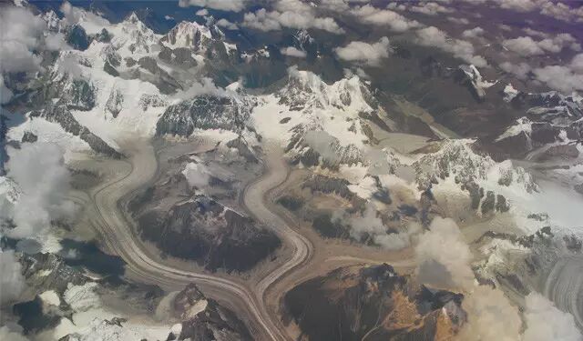 雪峰继续从机翼下滑过。刚才还在雪峰的东边,现在已是在那些高耸的雪峰的西边。我最熟悉的一条大冰川出现在眼前。在上方,它是两条冰川,两条冰川在一片铁灰色的悬崖下会聚在一起,两边的悬崖像一道紧紧的束腰,使得冰川在这里高高隆起,然后,变成一个宽大的扇面扑向山下。