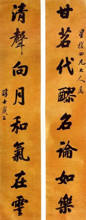 戴熙《行书八言联》 金笺,立轴 179×34cm×2 释文:甘茗代醪名论如乐,清声向月和气在云。 款 识:星槎四兄大人属。醇士戴熙。 钤印:戴熙(白文)、醇士(朱文)