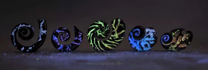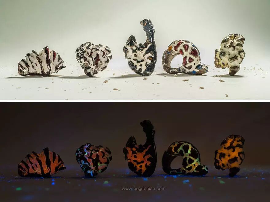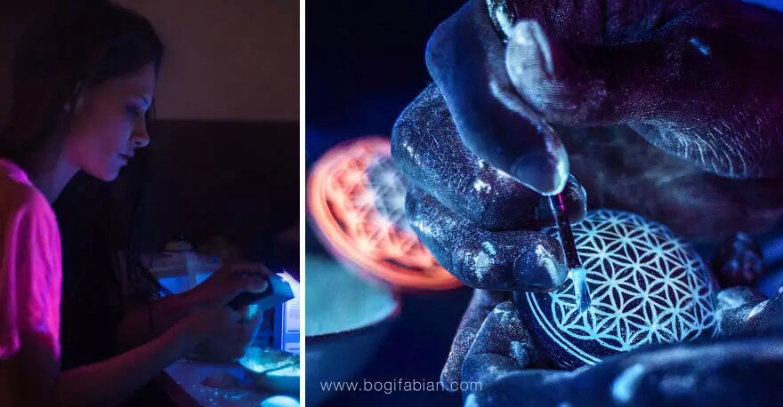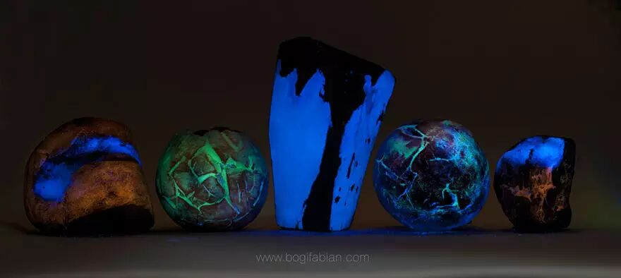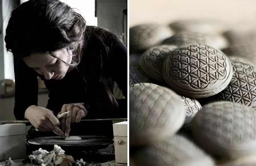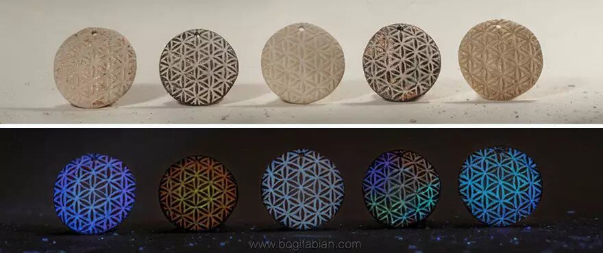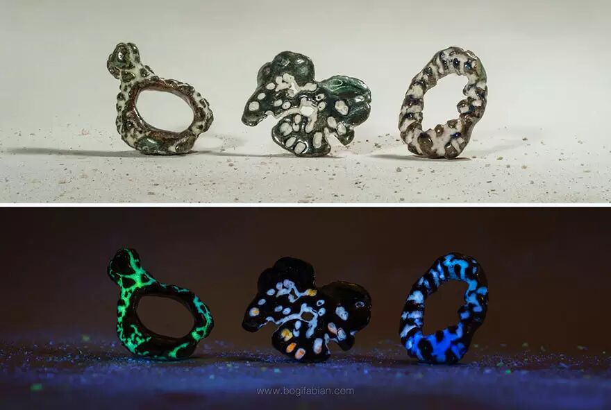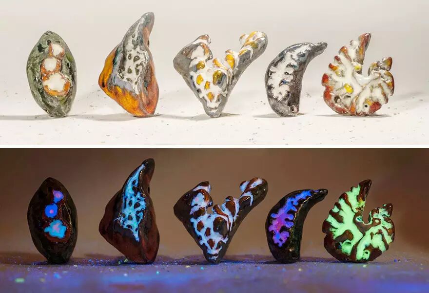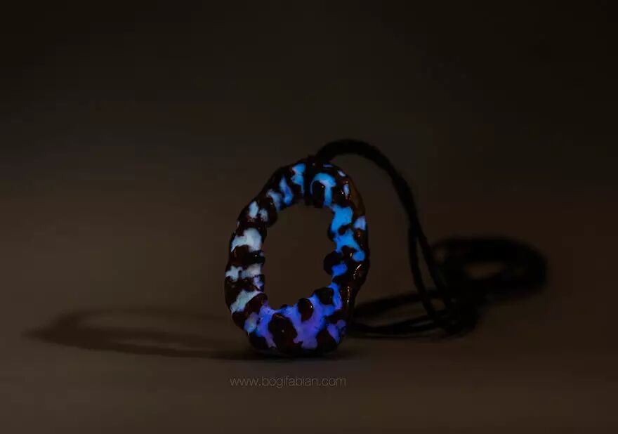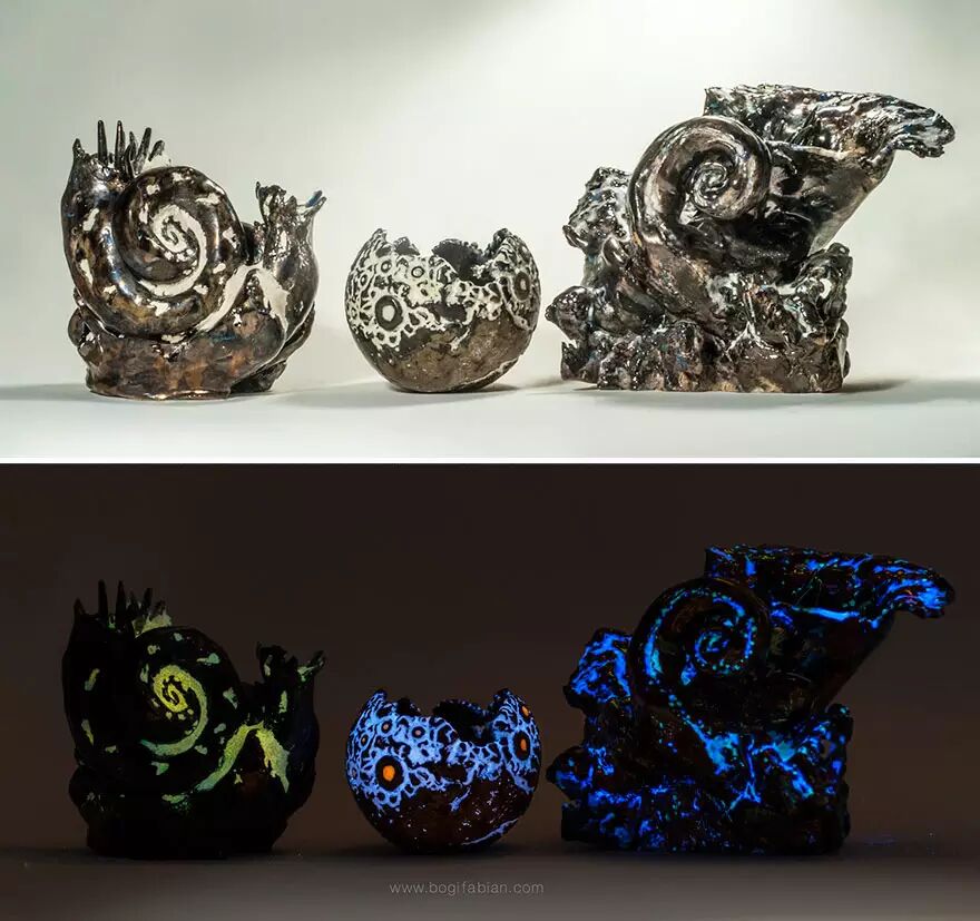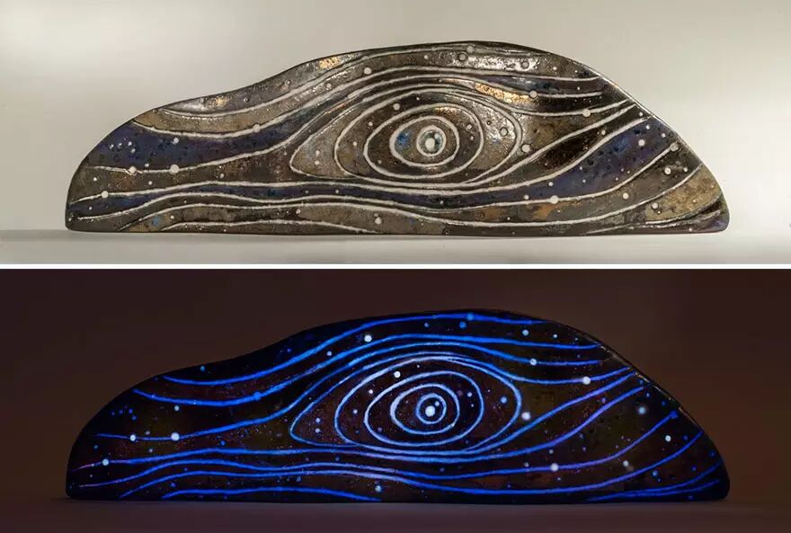 这些属于暗夜的陶瓷出自匈牙利艺术家 Bogi Fabian 之手,创作灵感来自大自然,混合了传统的匈牙利民族图案和东方装饰元素。每一件作品均由她亲手制作,通过烧制、雕刻、打磨、上色、抛光等 13 个步骤才能完成。它能在黑夜里发光长达 50 多分钟,然后通过吸收紫外线进行「充电」。