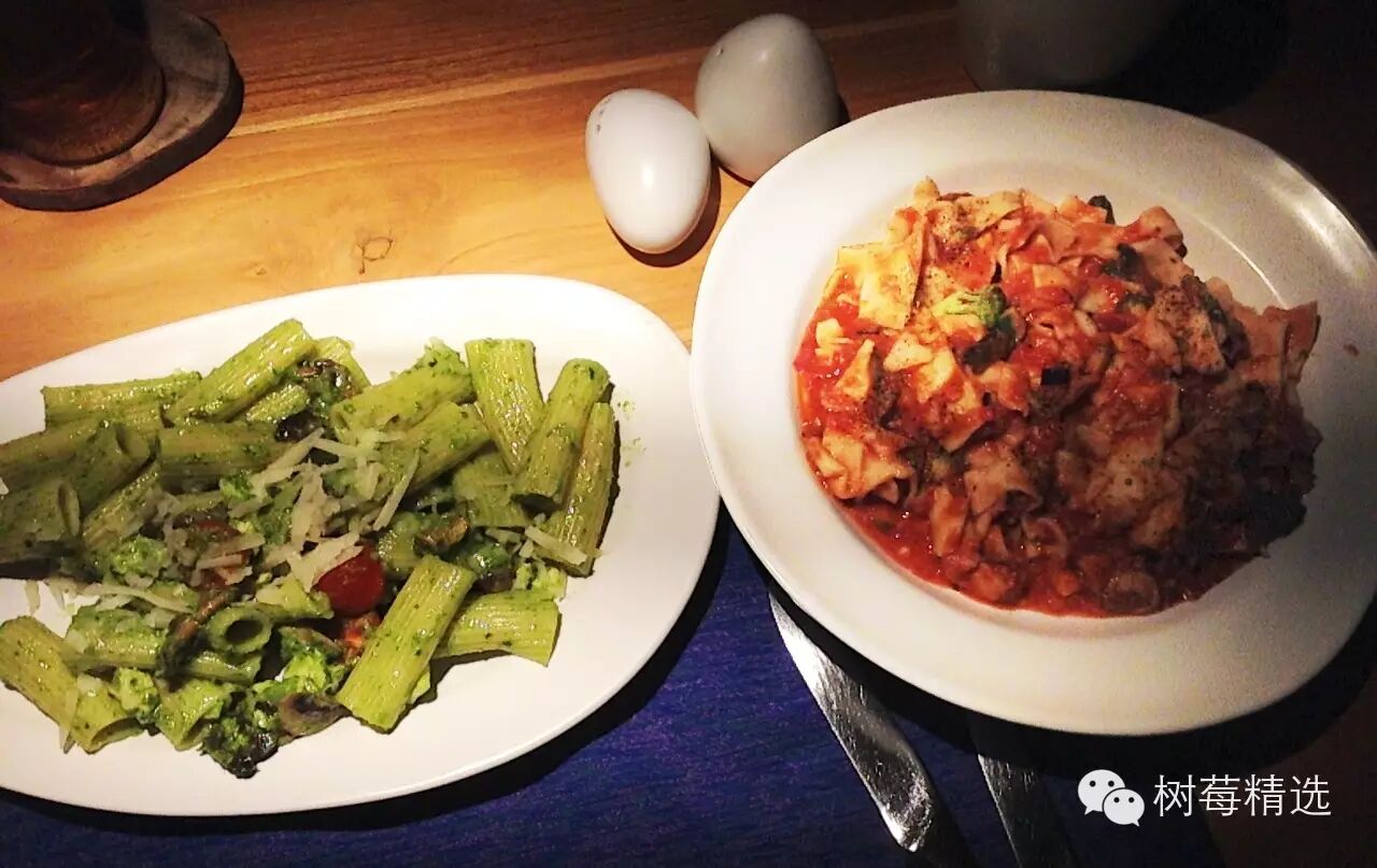 可是,一问之下才他们竟然都是装饰品(当时感觉那个失落)!!厨师还说不做上面那些吊挂着的,只做一些常规的pasta,于是我们无奈地拿了这两盘卖相欠佳的pasta: