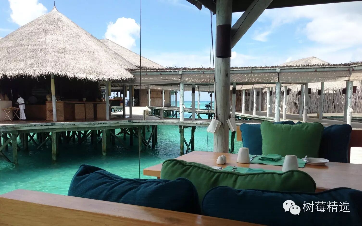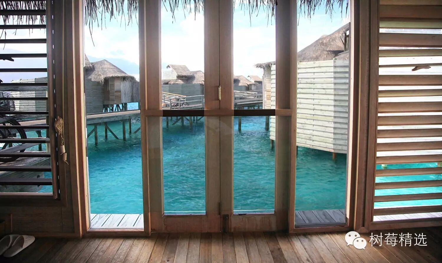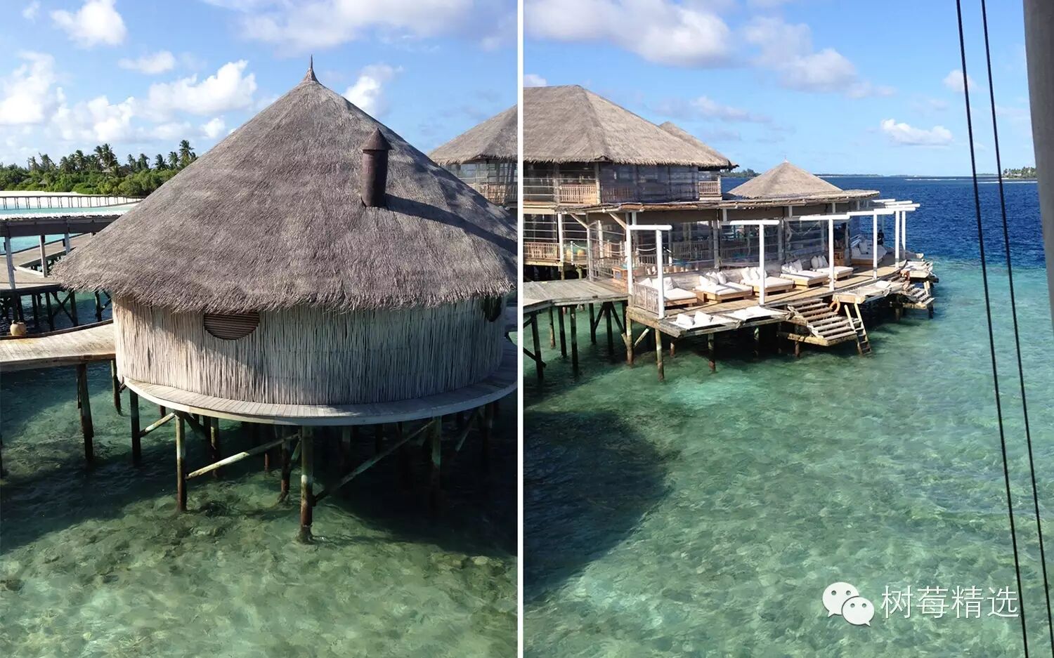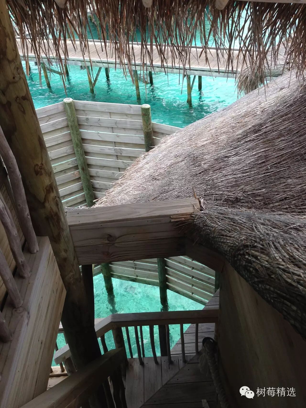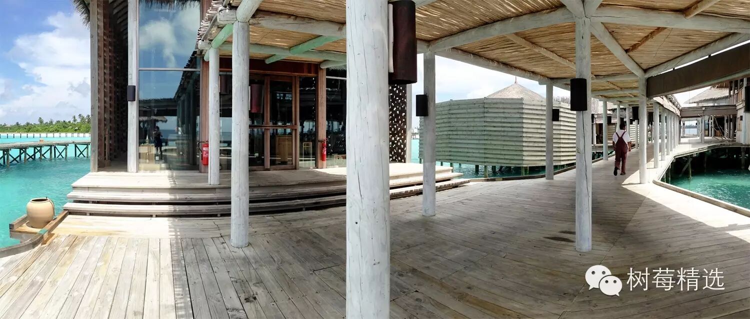 我们的villa是两层带阁楼的房子,确切的说是建在海面上的茅草屋(Water Villa),外面看着非常返璞归真,一条长长的木道连接着37个水屋,每个水屋又被小的栈连接: