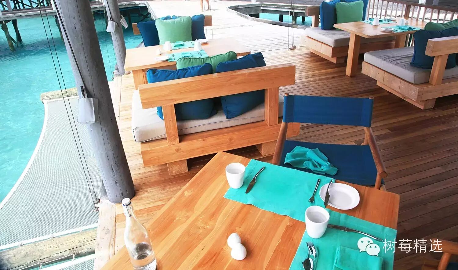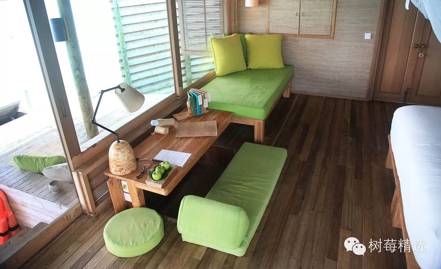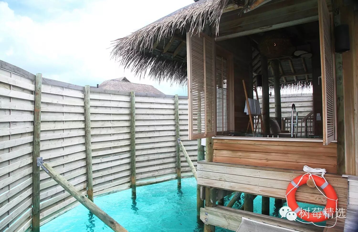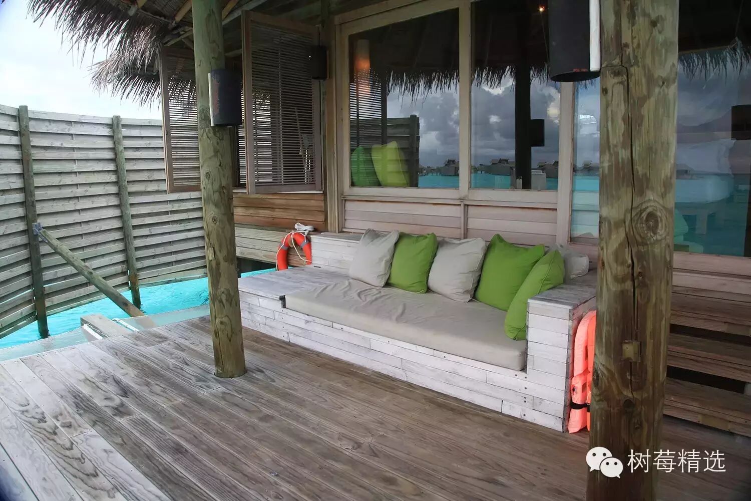 每间水屋都可以直接下海,沙发旁边还备了游泳圈和救生衣,方便水性不太好的人;