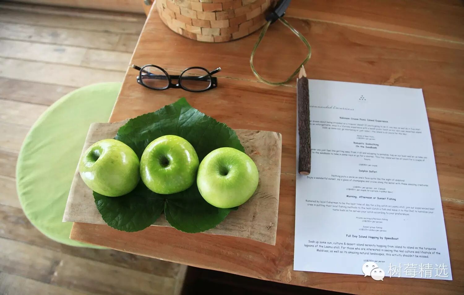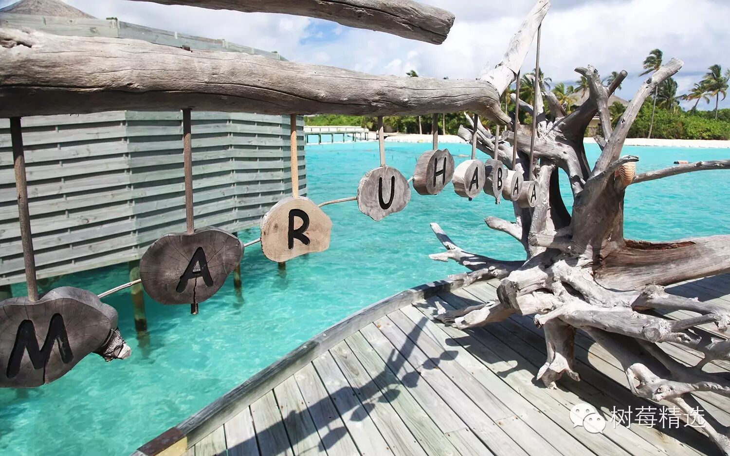 悬空的浮木上刻着马尔代夫的本土语-即民族语言迪维希语,Maruhabaa相当于“welcome” 欢迎的意思。