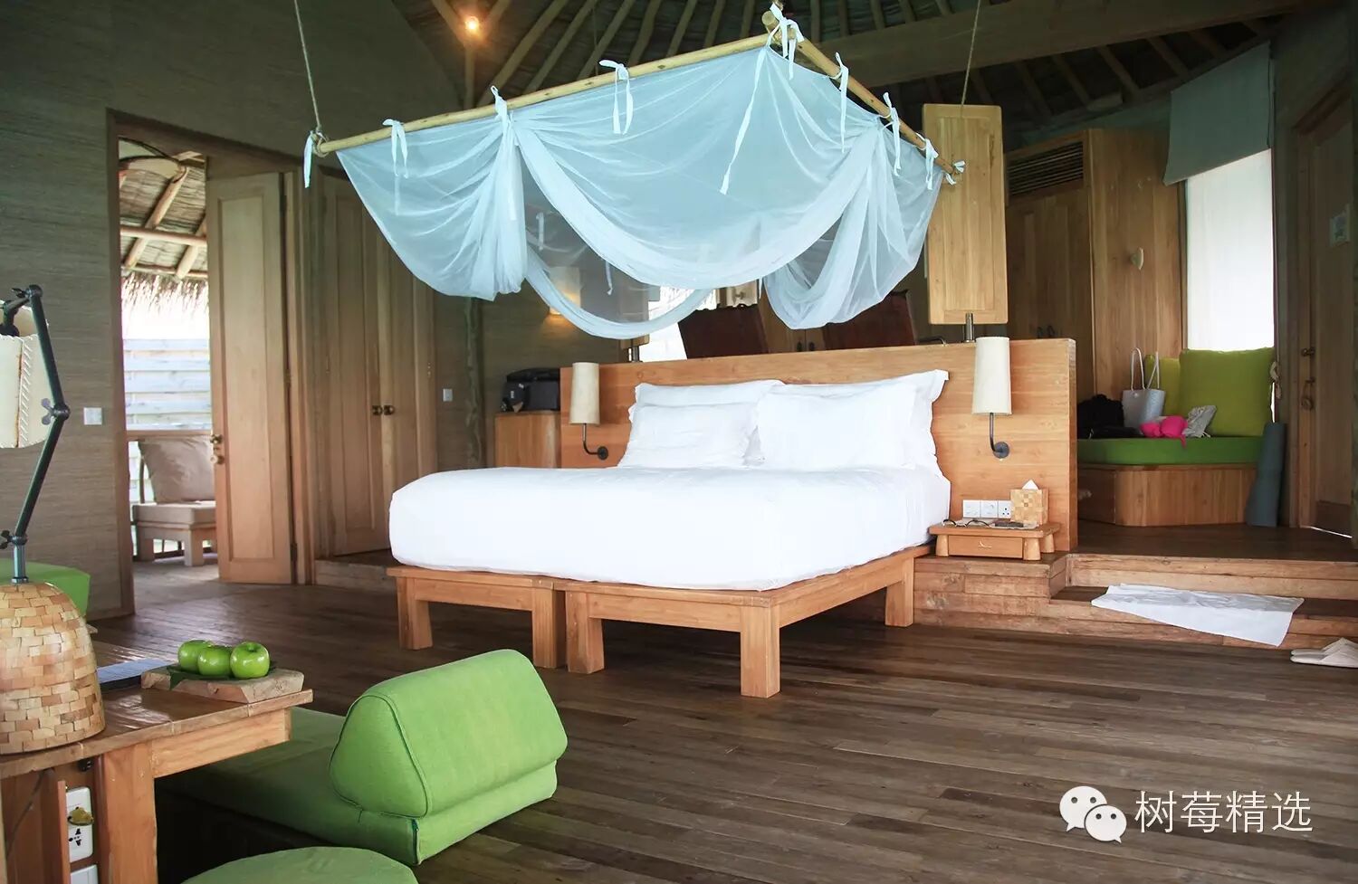 这里是个观星阁楼,从木质楼梯上去,可以看整个海景,躺在阁楼的小沙发上更是超级惬意,数数星星,聊聊人生。而且还不用担心蚊子,估计是水屋的关系,但沙屋那边就不是很清楚了: