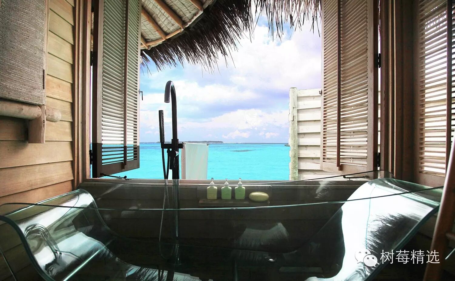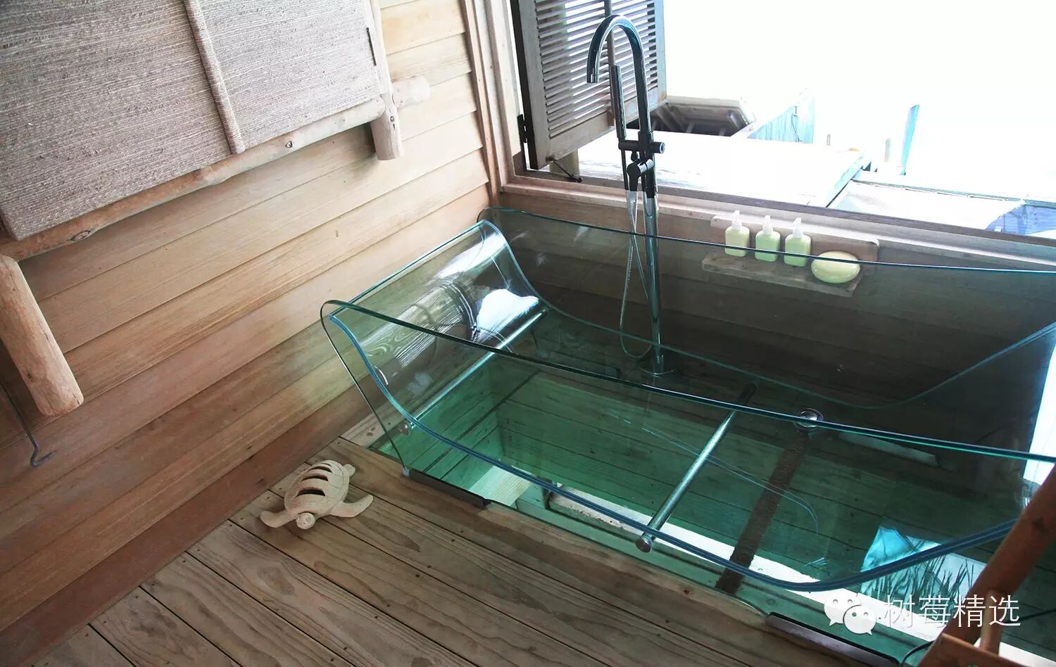 洗澡间里有个全透明的玻璃浴缸,这也是水屋司空见惯的设计 -- 整个浴缸下面是可以直接看到海的,偶尔有鱼群游过,像是沐浴在海里,躺在其中感觉很爽。