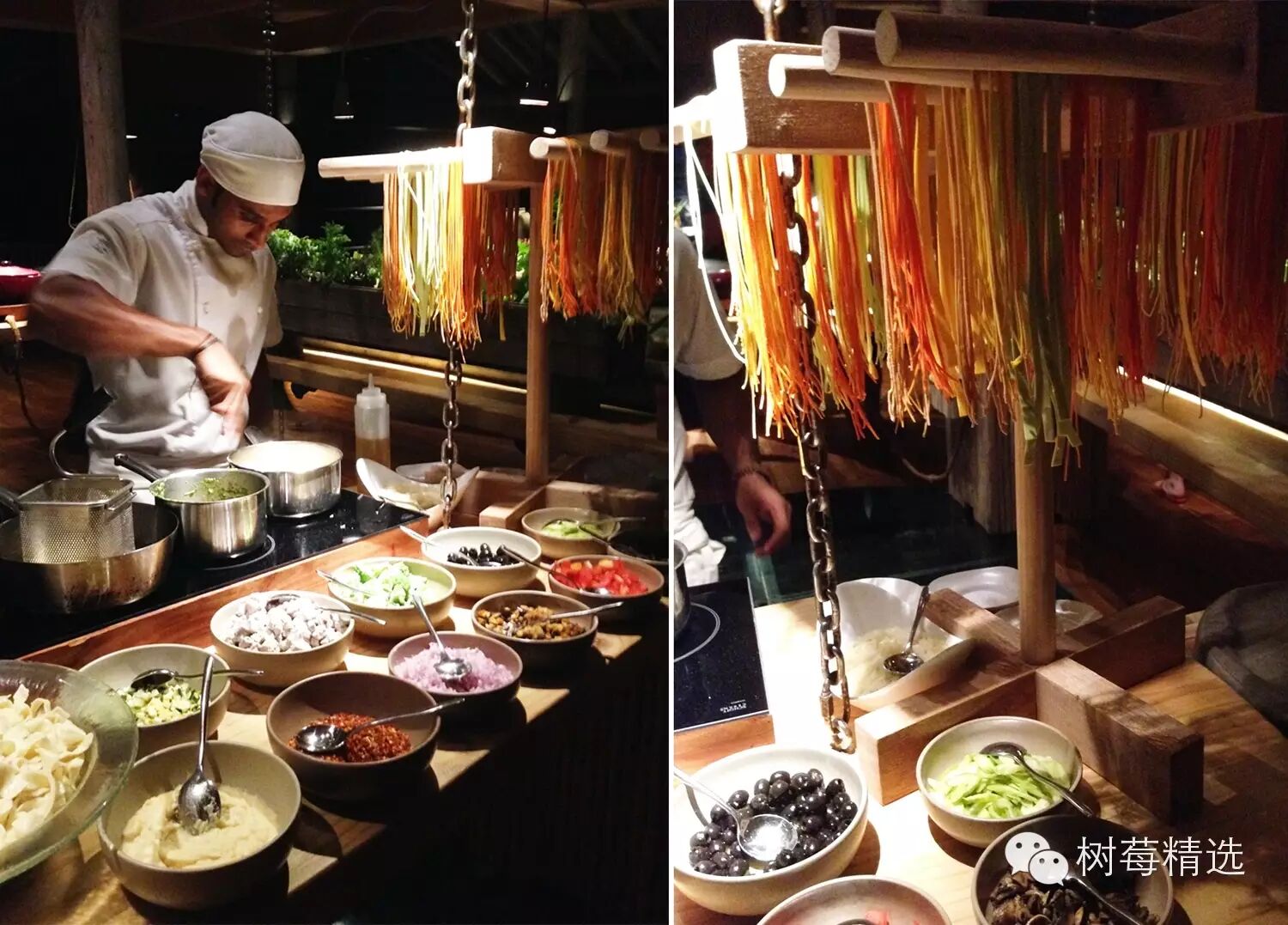 这些吊挂起来的意大利面(彩色的spaghetti)看得我当时各种心动, 绿色的是菠菜, 红色的是红萝卜,橙色的是南瓜,都是用天然的食材制成的(虽然看起来假假的五颜六色)