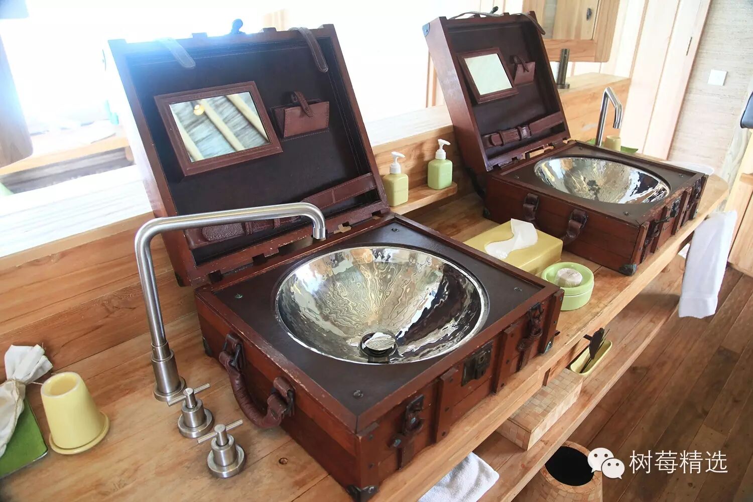 洗手池被做成一个仿古的英式木箱,设计别致有创意,当然这点我知道是什么原因,岛主是牛静大学毕业的高材生,英伦情节用到他的酒店里再正常不过了。