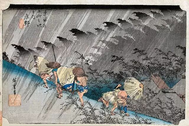 ▲《东海道五十三次》之《庄野:白雨》,歌川广重绘