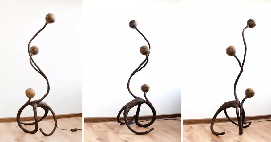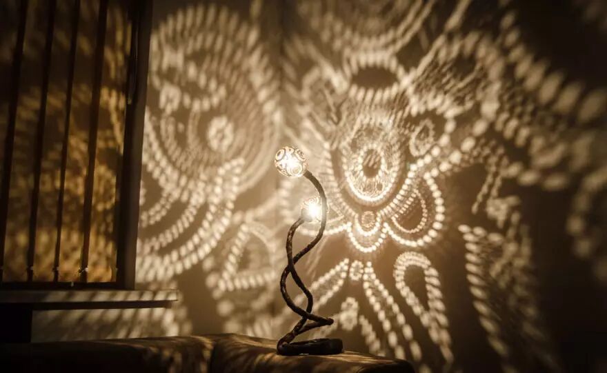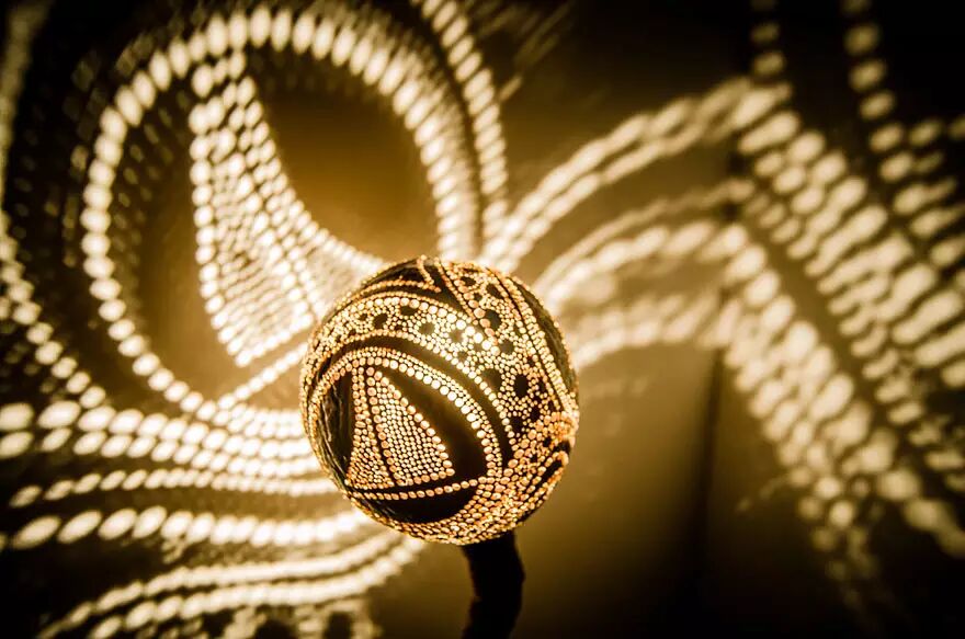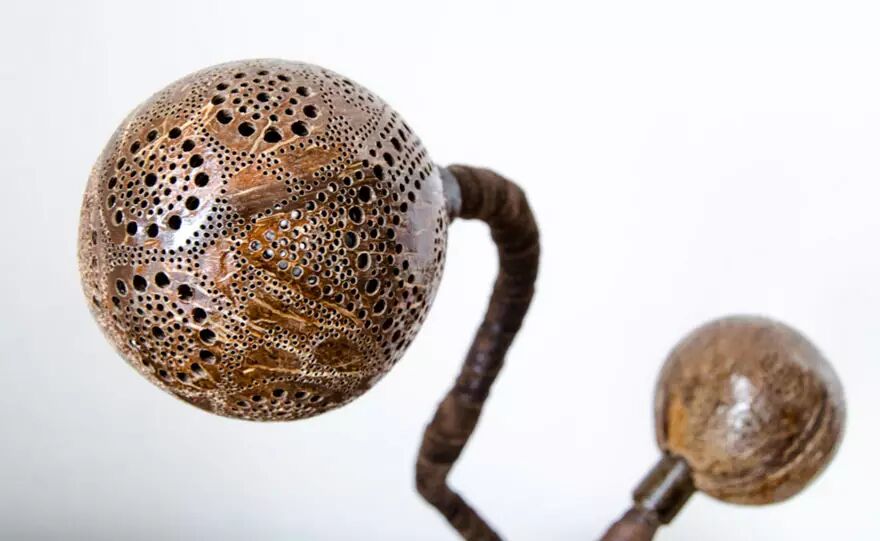 他花费了 9 个月时间在椰子上钻了无数个排列有序的艺术孔,使得照射出来的灯影拥有一种迷幻的浪漫。灯的支座就像是植物的根茎,动感而有活力。