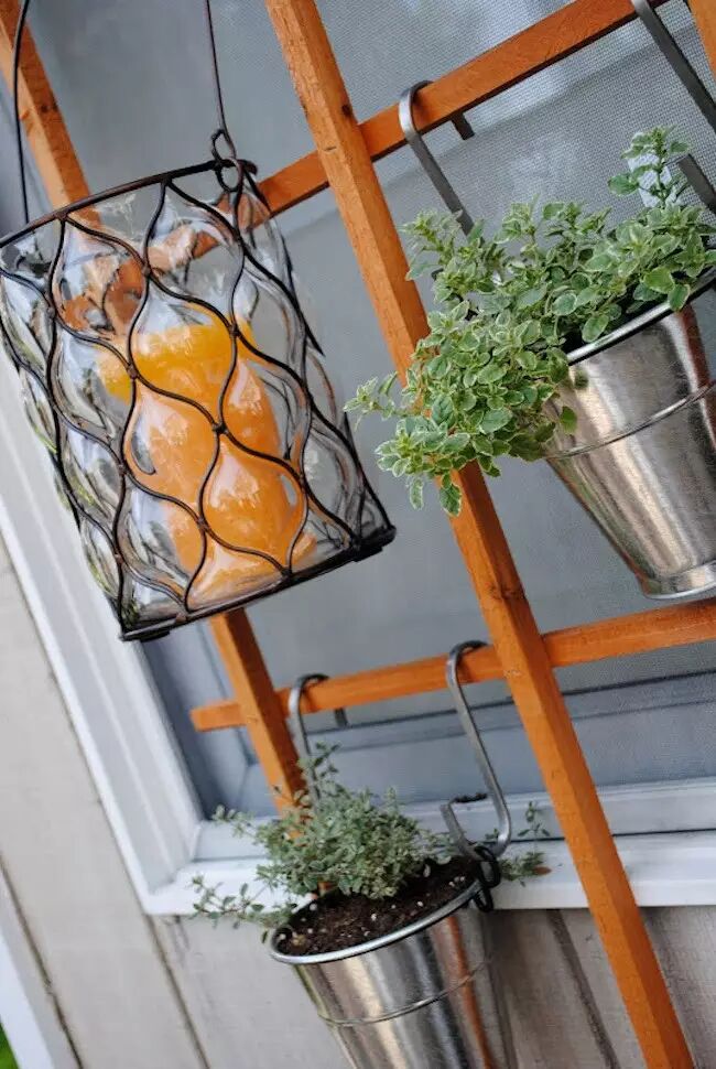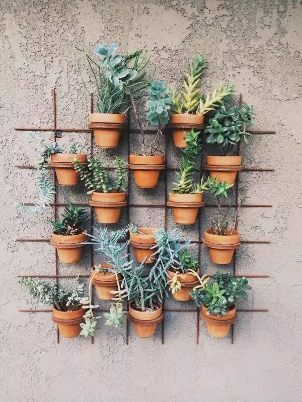 谁说盆栽只能放在桌子或者地面上的?除了这两个地方,你还可以把它们挂在任何一面你能看见的墙上。比如你可以模仿绿篱上的藤蔓植物,把它们挂在栅栏上,同时挂花盆比种植绿篱更加方便和快捷。