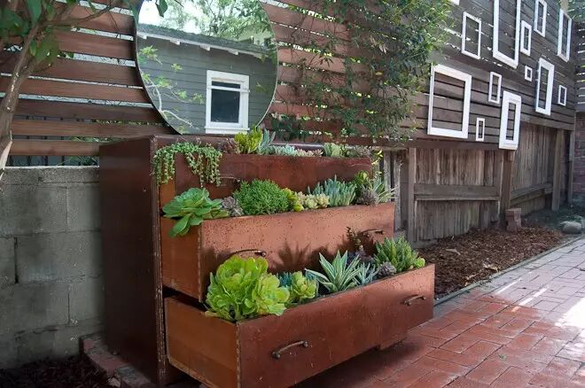 从挂盆、梳妆台、水管到抽屉,真的是奇思妙想天马行空。这样设计垂直绿化,同时带有装饰性和实用性的作用,而且制作简单而便宜。看完本文,就别再找任何借口了,赶快发挥你的园艺设计技能,让你的院子或阳台充满生机和活力!