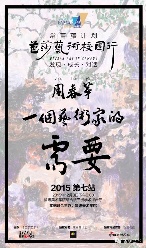 2015年12月8日,“常青藤计划·芭莎艺术校园行”第七站将邀请艺术家周春芽于鲁迅美术学院举办主题讲座“周春芽:一个艺术家的需要”,与年轻艺术学子们分享自己的创作历程。