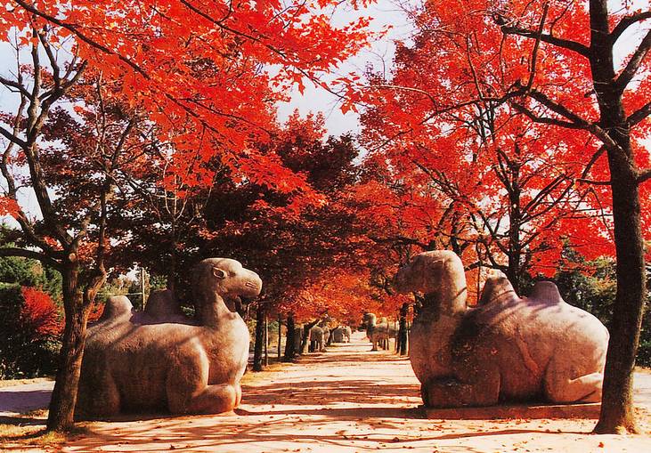 明孝陵是明朝开国皇帝朱元璋和皇后马氏的合葬陵墓,因皇后谥“孝慈”,故名孝陵。要说明孝陵最美的时节,非11-12月莫属。800米的神道蜿蜒曲折,两侧火红的枫叶吸引无数摄影爱好者。南京画册上的明孝陵枫叶已成为南京的名片。