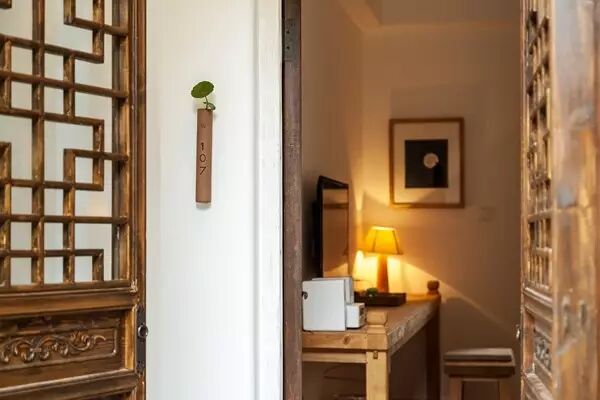 更加难得的便是仅有19间房的四合院里,以亚麻织品与木质家具营造的天然系空间里,配备了宜家IKEA标志性的白色边框电视,MUJI的低反弹乳胶坐垫,百年传奇的金可儿床垫,多功能音乐体验的BOSE音箱, 黄铜质感的记录笔,居住体验与舒适度极佳。