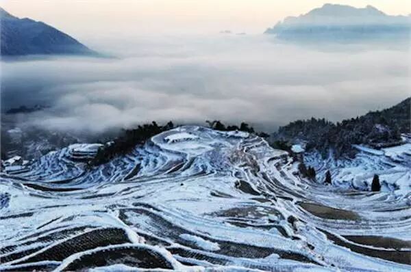 看遍了北方白雪皑皑铺满大地,或层层积雪堆积山岭,不如尽情感受南方里冰雪赋予梯田的别样风情。