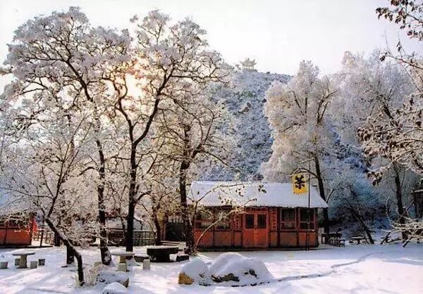 “最妙的是下点小雪呀。看吧,山上的矮松越发的青黑,树尖上顶着一臂地白花,好像日本看护妇。山尖全白了,给蓝天壤上一道银边。”——老舍《济南的冬天》。