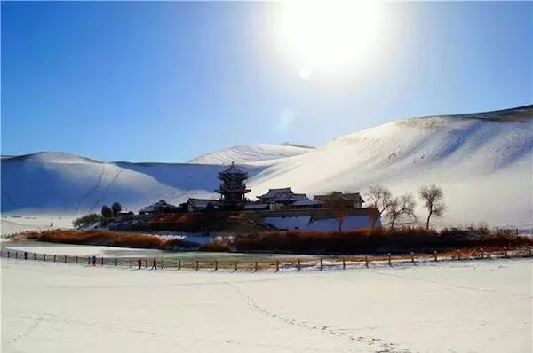 鸣沙山月牙泉雪后初霁,大漠里一片银装,点缀远处黄沙,遮天迷地。