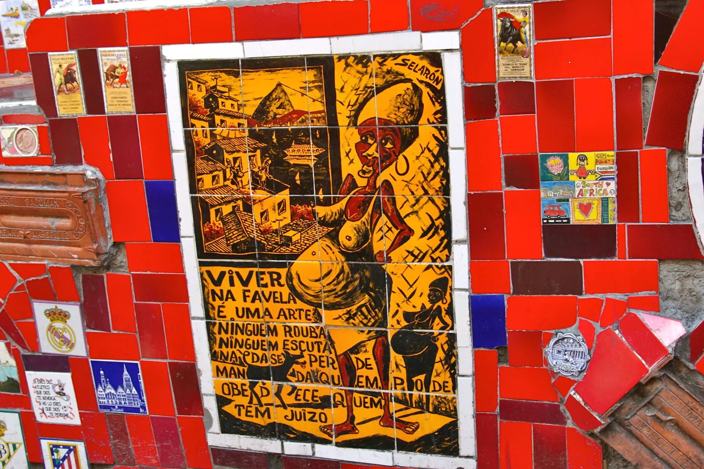 这条阶梯长达125米,共250个台阶。阶梯的创作过程不断的发生变化,一块区域没完成就开始另一块区域,不断改善完成,从而产生了独特的艺术性。起初这些瓷砖都是来自于工地或是丢弃在街边的瓷砖。但是初步成型后的几年便收到了来自世界各地的捐助瓷砖。在超过2000片瓷砖当中,有300多片是设计师描绘一个非洲孕妇的手绘瓷砖,当中原因不得而知。对于这条艺术阶梯,设计师 Selarón称“这是一个“永不完结”的工程“这疯狂的梦想将一直持续到我生命的尽头”。