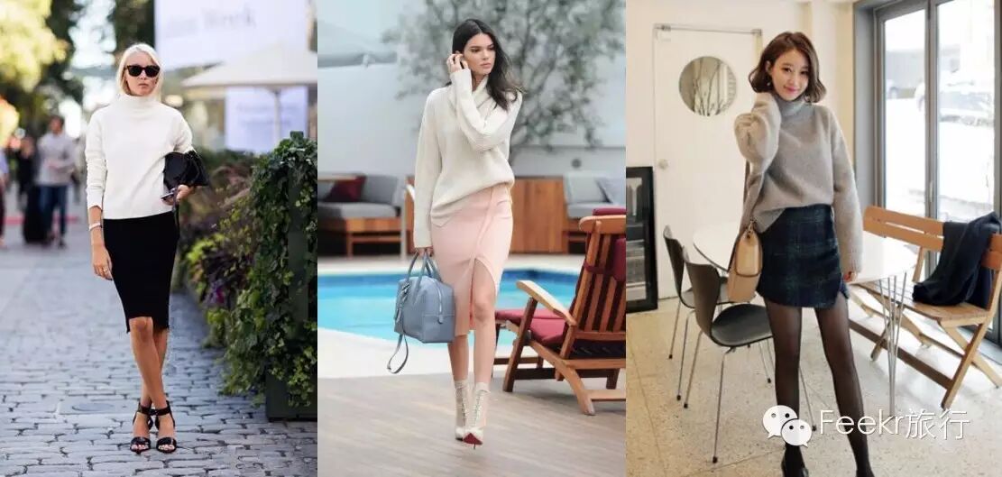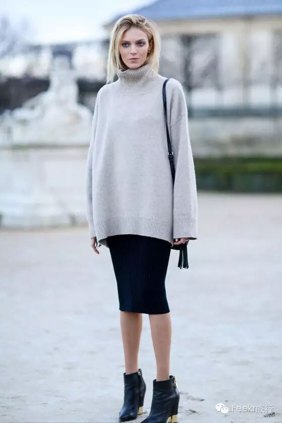 ▲oversized高领毛衣和铅笔裙最配了,尤其是那种过膝的铅笔裙,冬日来袭,你觉得这么穿冷的话可以加一双打底袜,如果你想稍微增加点时尚感,可以学上图一样塞一点衣角,