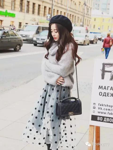 ▲波点百褶裙搭配灰白色的高领毛衣,顿时显得清新又年轻,再加一顶贝雷帽,打造甜蜜复古风。