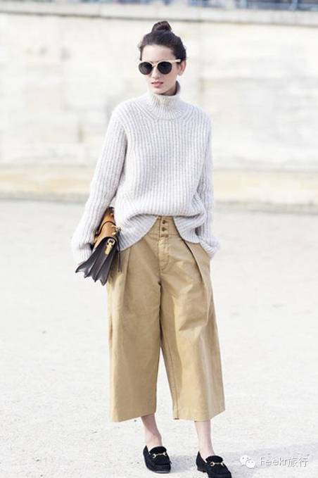 ▲高领毛衣与阔腿裤也常常走到一起,时装Icon们用这样的搭配展现了女性不一样的帅气与精炼,配上对比感强烈的阔腿裤,性感洒脱的时尚名伶就这样诞生了。高领毛衣与卡其色七分阔腿裤搭配,经典耐看。