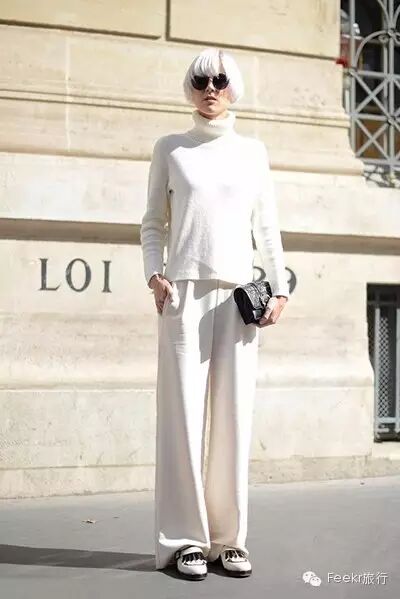 ▲白色高领毛衣,清新素雅的风格,简单好看,搭配同色系阔腿裤和白色皮鞋,拿着黑色手包,巧用黑白色系打造优雅形象。搭配长款阔腿裤,及解决了保暖为题,又有着干练女Boss的气质。