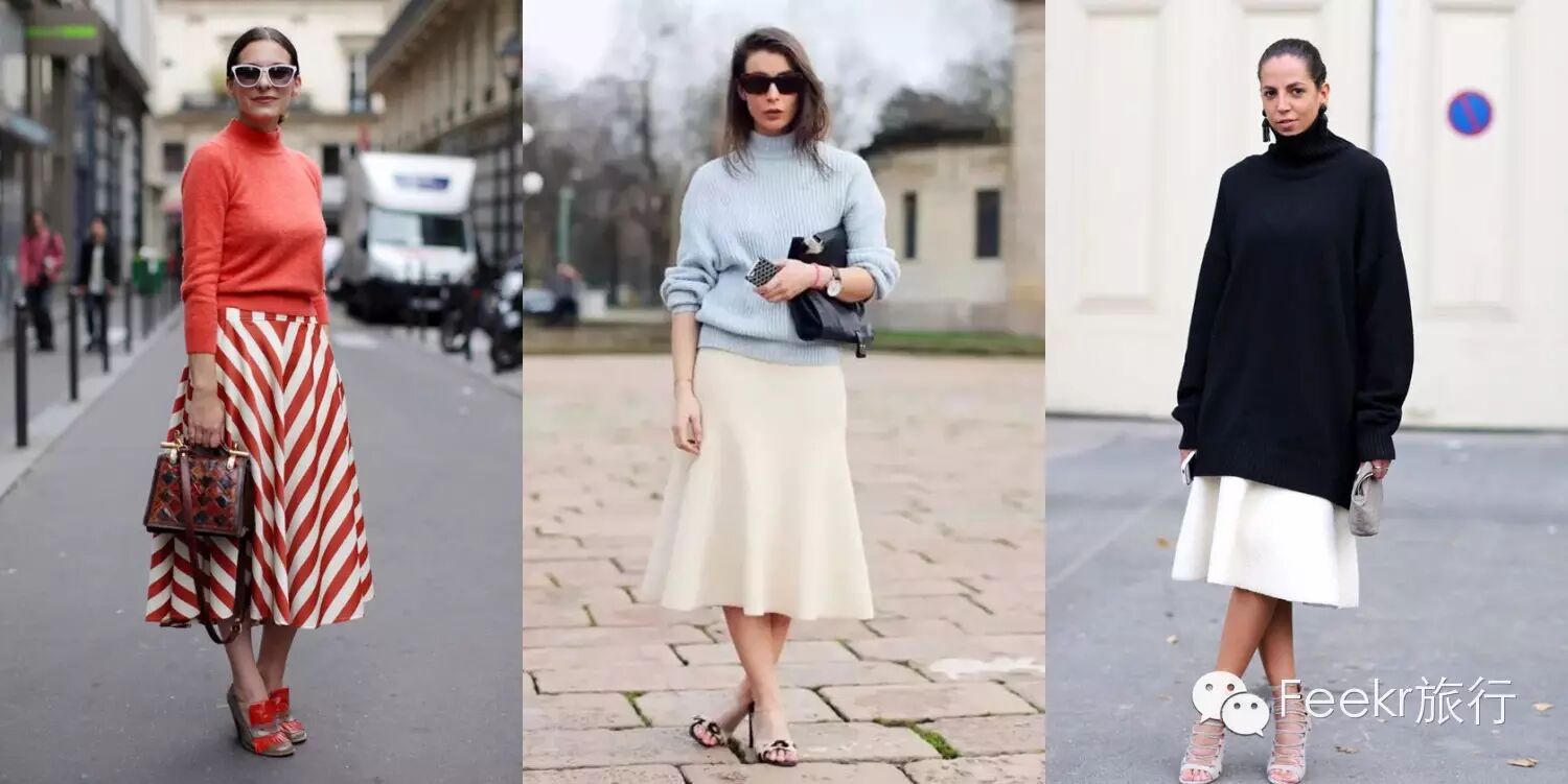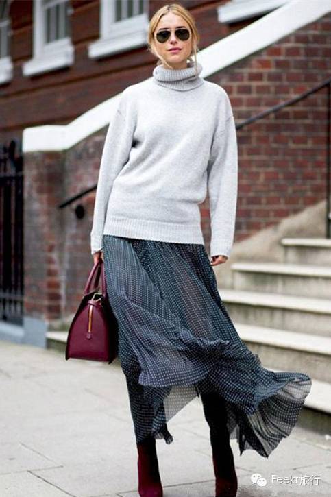 ▲百褶裙或印花裙搭配高领毛衣,裙子飘逸的质感打破了高领毛衣古板的印象,立即使你的形象活力四射起来。而且不同材质的混搭也让你看起来比较有品。