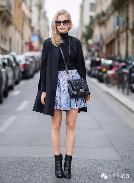 ▲如果觉得黑色太无聊,还可以把下面的短裙换成印花裙,显得清新养眼不少,给冬日注入浪漫气息。