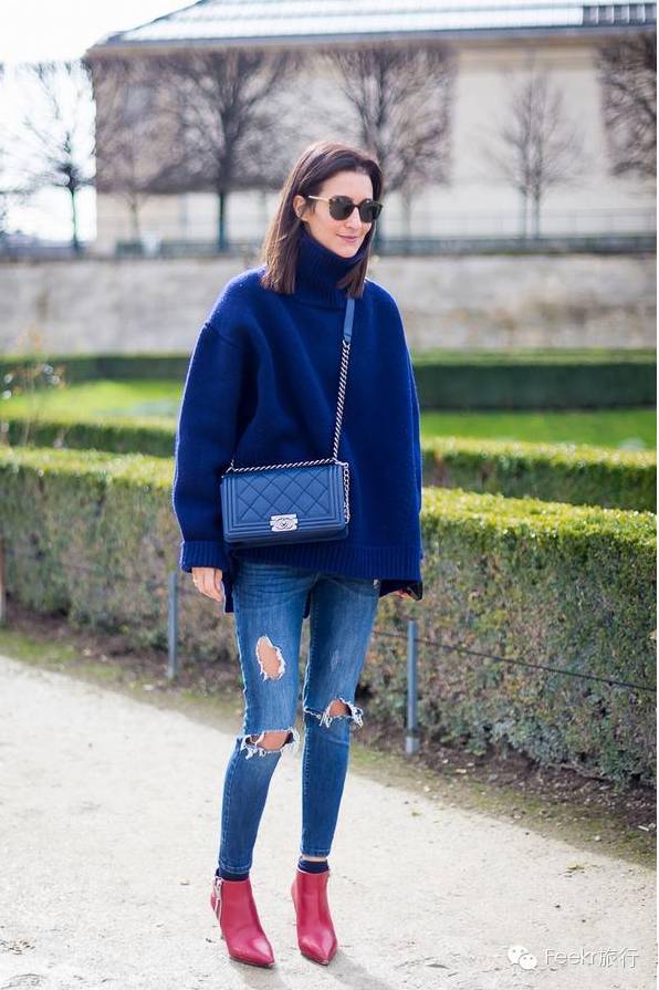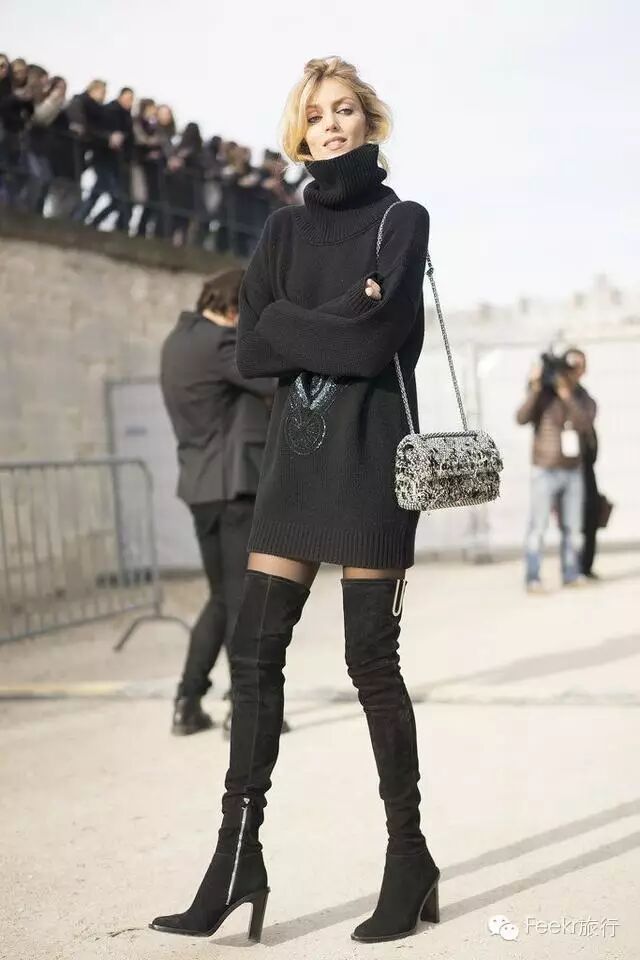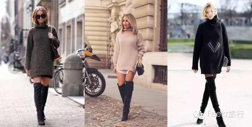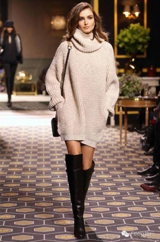 ▲刚刚盖过臀部的毛衣裙永远都是最性感的长度,而这个长度配任何单品都显得累赘多余,只有跟过膝长靴才是最好的CP。如果你不知道靴子毛衣裙怎么搭配起来好看,记得两者之间露出5—10Cm肤色才是最佳的长度。