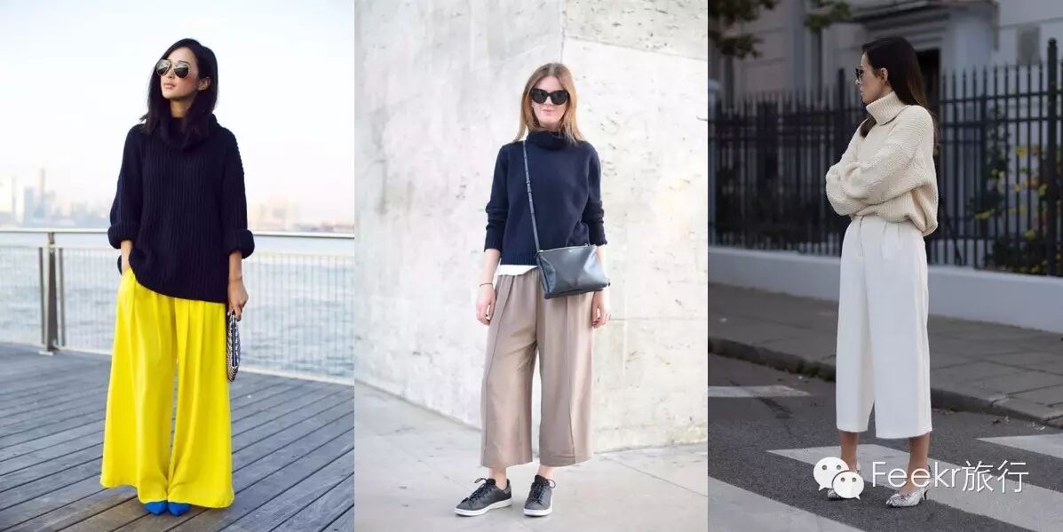 阔腿裤时刻都是休闲的典范,配平底鞋最合适,简约的斜挎包也少不了,整体给人简约大器。无论是从时装周还是从街拍看,今年的流行又再一次向80年代看齐, 阔腿裤的风潮势必再回归。欧美的潮人早已穿上阔腿裤压马路,爱美爱时髦的你怎么可以错过!