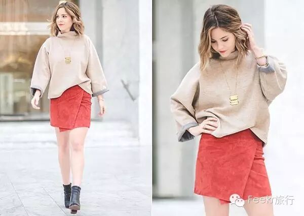 宽松的高领毛衣搭配修身麂皮半身裙,会让你看上去有型又显瘦的,将毛衣的一角随意的掖进裙子里一点,这样看上去更随意自然有层次感。