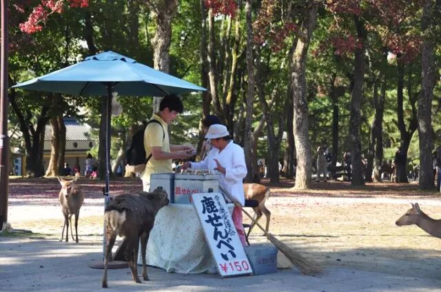 近铁奈良站出来,不用刻意找,走着走着就进入了奈良公园,一个开放性的大型城市公园,沿路全是草坪和小鹿。这是一个人与鹿共生同处的精致小城,花150円(人民币大概8元)就能享受被小鹿添手,被鹿群追逐的感觉,你是不是愿意试试?