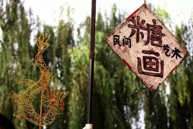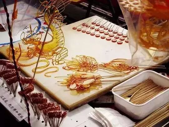 糖画小摊的周围往往挤满了人,这些人大都是孩子,他们争着吵着旋转竹箭,当箭头指向什么图案,便意味着你选定了什么样的图案。这时候,艺人们便用汤勺舀起溶化了的糖汁,在光滑的大理石板上飞快地浇铸,画出各种生动有趣的造型。