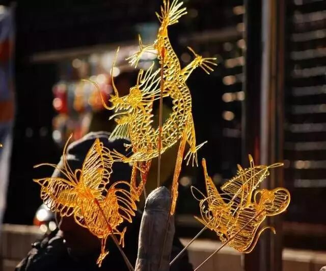 这些造型风格迥异,姿态万千,每一种都随着糖丝的挥洒栩栩如生地呈现在你面前,待稍微冷却之后,用小铲刀将糖画铲起,粘上竹签,便大功告成了。不过,也有些鬼灵精的孩子,属龙属牛什么的,制作工艺复杂些,糖分也多,就直接不去转动了。