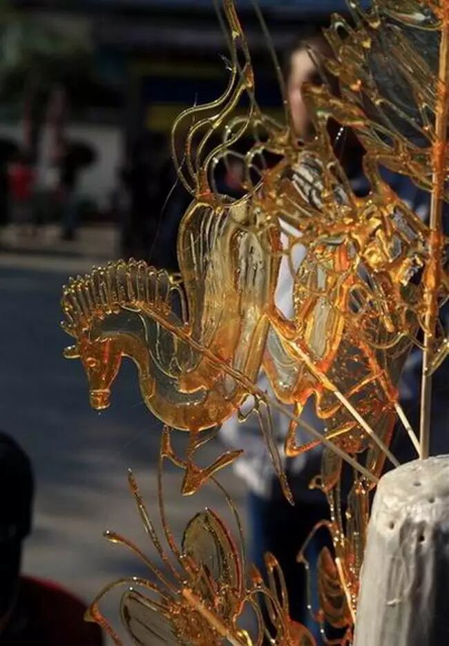 做糖画的人都是即兴的,需要一定的绘画功底,不然画出个“四不像”来,就没什么品味的乐趣了。无论你想要什么样子的糖画,他们脑中早已有了一个清晰的轮廓,得心应手,一气呵成。这样的江湖美学,不仅小孩子见了喜欢,就是老人见了也惊叹连连。