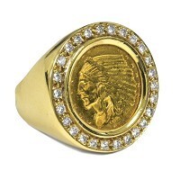 戒指中央为一枚制作于1914年的「2.5美元金币」,表面雕刻有印第安人头像,背面为老鹰图案,可透过戒指背面看到。硬币周围镶嵌26颗钻石,总重约1克拉。这枚戒指原本由 Elvis Presley 亲自佩戴,1970年代,Elvis Presley 在举行全球巡演期间将其赠送给巡演组织者 Tom Hulett。