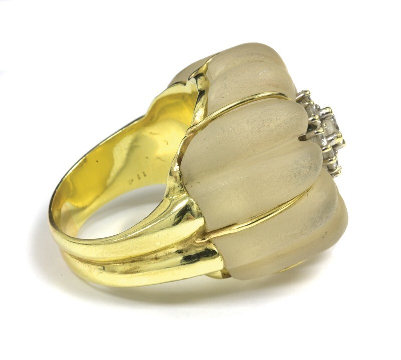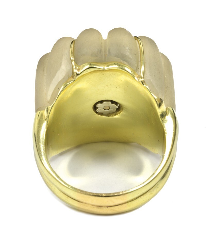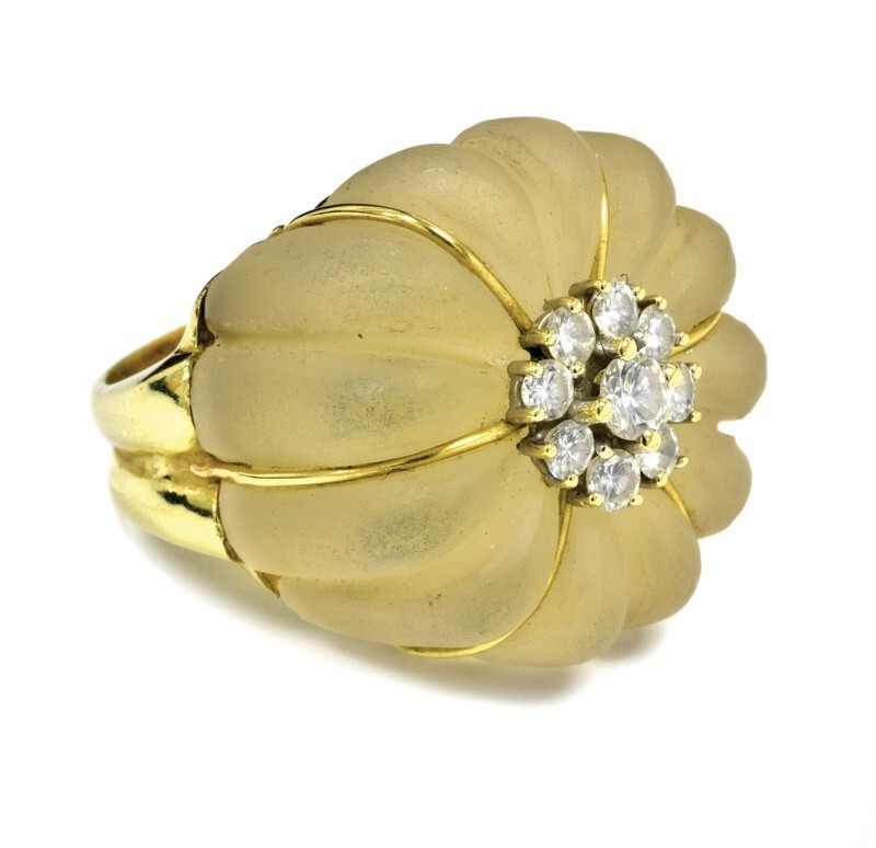 戒指中央镶嵌一颗花朵造型水晶,表面呈磨砂质感。花芯镶嵌9颗总重0.98克拉的钻石。这是1974年 Elvis Presley 赠送给女友 Linda Thompson 的礼物。