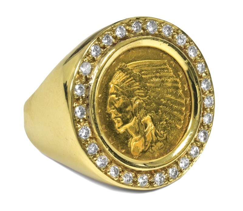 猫王在现场演出时习惯佩戴多枚戒指作为装饰,尤其是镶嵌蓝宝石和古币的戒指。本场估价最高的珠宝单品就是一枚镶嵌「2.5美元金币」的戒指,硬币闪耀的金属光泽与黄金戒托互相映衬,戒面边缘还点缀有一圈钻石。这枚硬币制作于1914年,正面浮雕有印第安人头像,背面则为老鹰图案