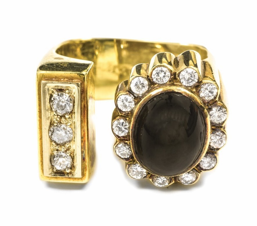 呈数字「10」造型,以圆形钻石分别勾勒出「1」和「0」字样,数字「0」中央镶嵌一颗重2.5克拉的弧面切割黑色蓝宝石。这枚戒指原本由 Elvis Presley 亲自佩戴,后转赠给一名工作人员 Richard Davis。