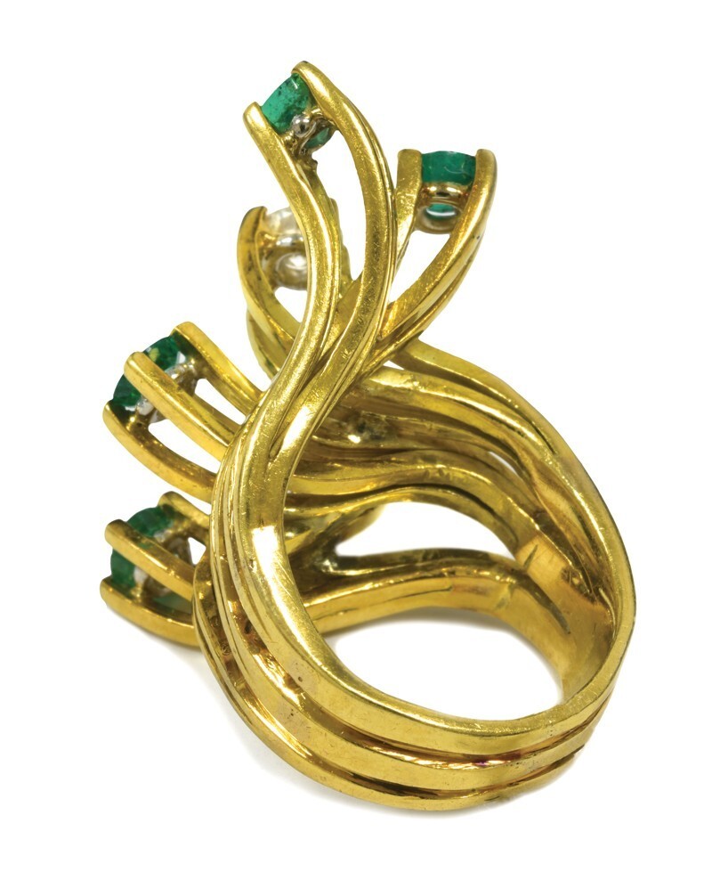 共镶嵌4颗总重0.64克拉的祖母绿,2颗总重0.4克拉的圆形切割钻石。宝石的4枚镶爪由戒壁自然延伸而来。1972年,Elvis Presley 向拉斯维加斯珠宝商购买了这枚戒指赠送给女友 Linda Thompson。