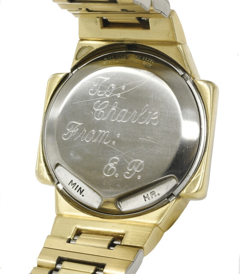 黄金表圈,精钢表背,搭载石英机芯,调校按钮位于表背,可通过表扣中隐藏的磁铁激活。这枚腕表是 Elvis Presley 赠送给好友 Charlie Hodge 的礼物,表背镌刻有「To: Charlie From: E.P.」字样。1974年8月30日,Elvis Presley 购买了30枚相同的腕表赠送给亲友,共计8000美元。