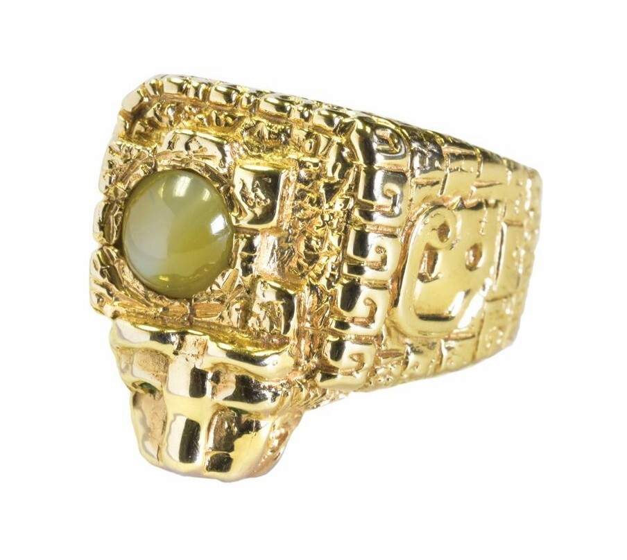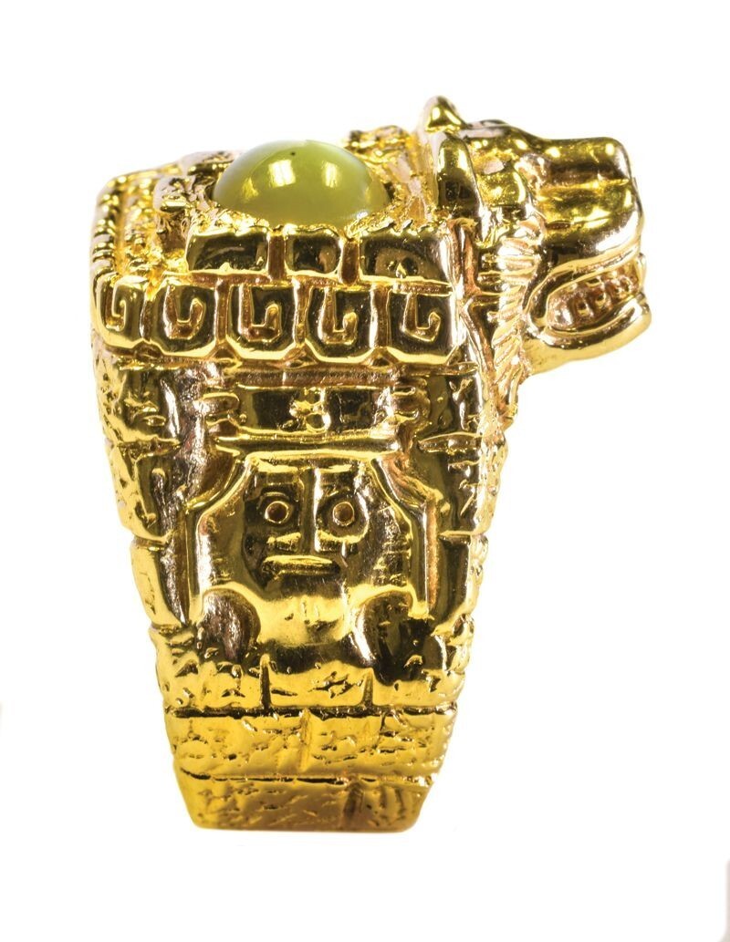 中央镶嵌一颗不透明的弧面切割绿玉髓,戒指侧面雕刻有一只豹头,眼睛部分镶嵌绿色碧玺。Elvis Presley 将这枚戒指赠送给保镖 Sam Thompson。