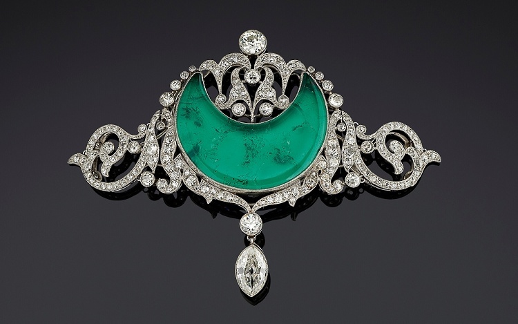 法国设计师 Paul Iribe 1910年代的作品,这枚装饰艺术风格饰品以一块六边形刻面祖母绿为主石,雕刻于莫卧儿时代(1850年-1900年),表面刻有花卉、树叶等元素;放射状图形通过蓝宝石、钻石、珍珠连缀而成。