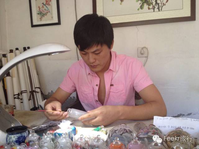 光远今年20岁,从小与爷爷学习国画,2003年时,他从广播中得知了内画,后师从内画大师王习三的儿子王又三,11年的潜心苦练,才造就了如今的他。只见他将一支弯曲成90度的笔满满深入鼻烟壶中,然后在半透明的壶内作画,随着瓶内的弧度来调整笔触。“画内画首先需要坐得住,要沉下心来好好钻研。”当年和光远一起学的人,很多都放弃了。
