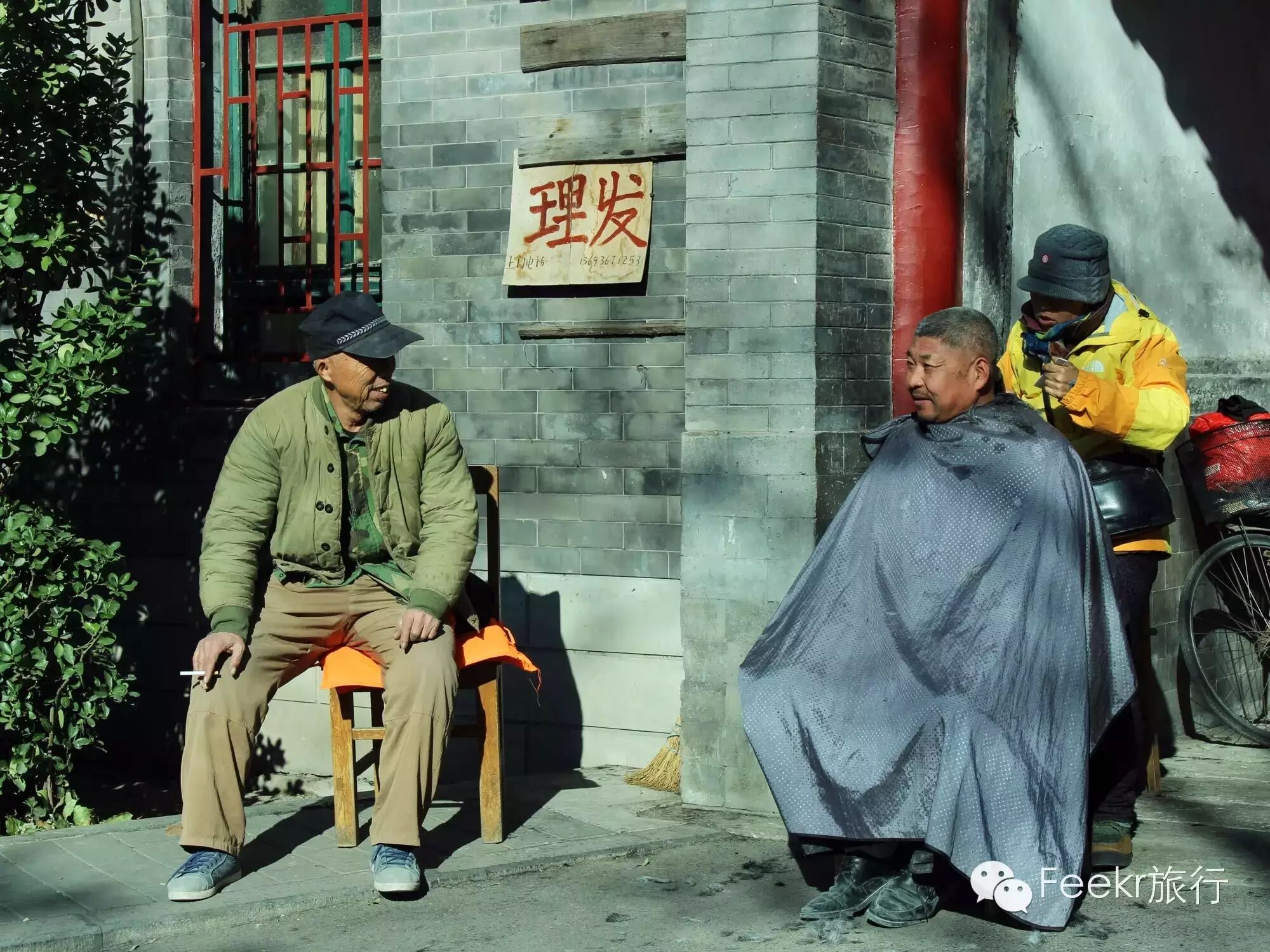 而胡同里最亮眼的一幕莫过于街边理发,一条长袍式的围布一裹一批,“手起刀落”间一剃一梳,还能与旁边排队的人唠个家常,生活,就该如此悠闲。
