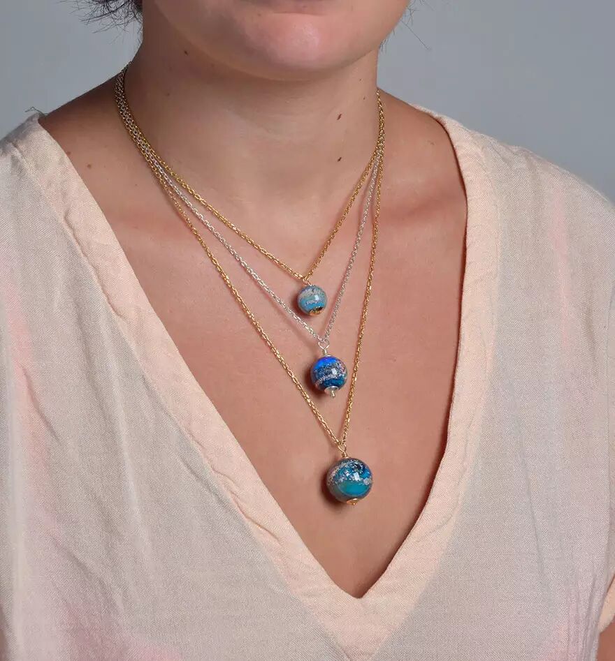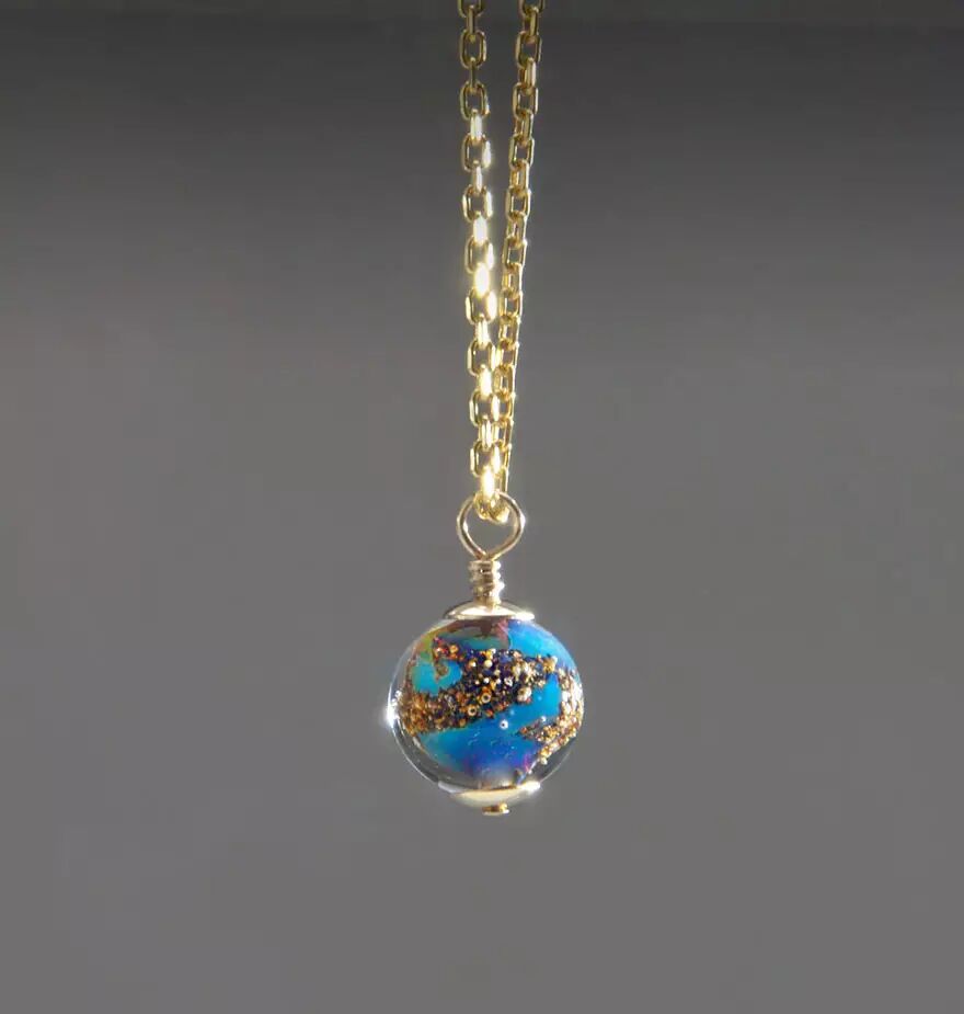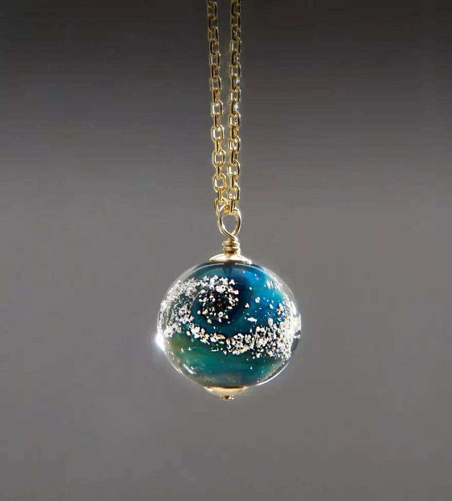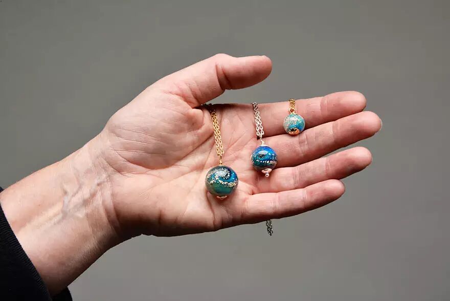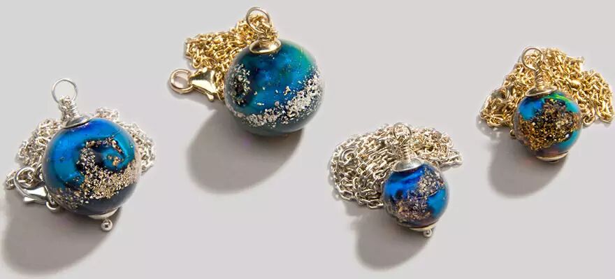 是的,这条项链很美。远处看,它就像一个小小的玻璃星球,散发着迷人的蓝色光泽。但谁能想到,它的制作材料竟然是骨灰呢?