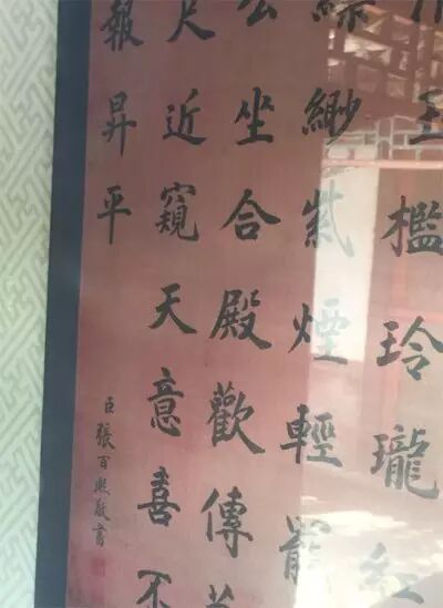 偶然间透过玻璃,我在东暖阁发现一幅张百熙的字,落款是:臣张百熙敬献。纸张已经黄旧,散发出岁月的老去。上面有两句:“玉槛玲珑红露重,金炉飘渺紫烟轻”。出自金末元初的诗人杨奂的诗句:“玉槛玲珑红露重,金炉缥缈翠烟轻。”但杨奂写这首诗是在金章宗御试的考场上,是一首《试万宁宫》里的诗句。我很好奇张百熙这幅书法是献给皇帝的?还是给皇后的?当然,最有可能是某日皇帝与臣子把酒,雅兴乍起,臣子当场书写的阿谀奉承应景之作。但是,这幅字如何放置于皇后的东暖阁,就不得而知了。这两句里的“红露”、“紫烟”倒是很应这个寂寞小院子的景,尤其“翠烟”改成“紫烟”真是透出了皇后的哀愁。