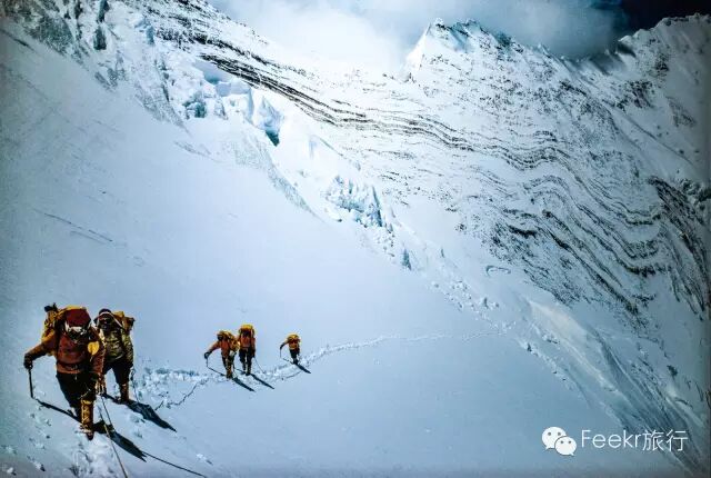 第一支登上珠峰的美国队伍。为了纪念国家地理学会成立75周年,派出一支探险队征服珠峰,路过洛子峰时拍摄的照片,探险队员背负沉重的补给品前行,一共约27吨重的补给,外有8.5公里的底片,19名探险家,32名雪山向导。