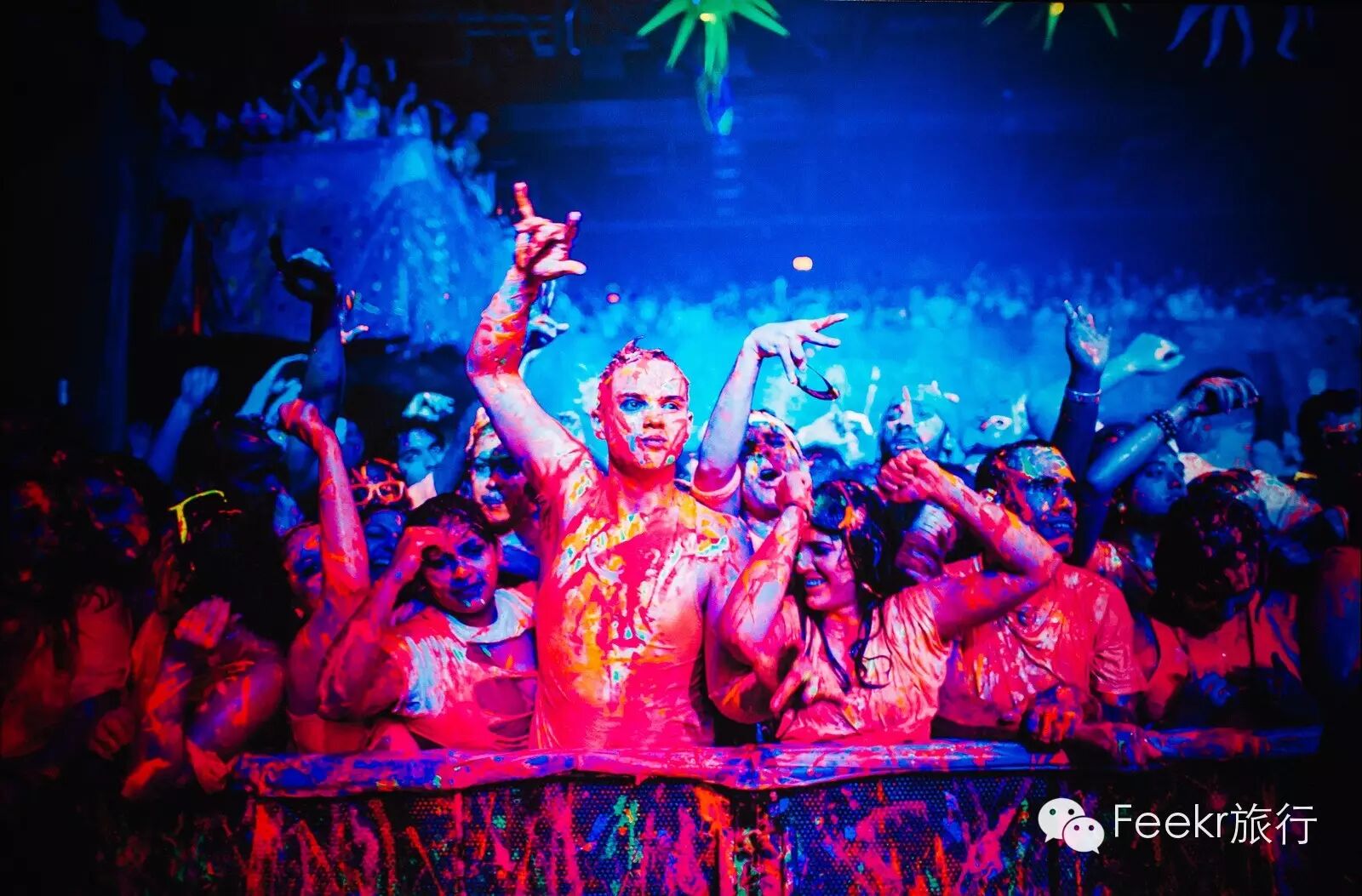 比肩接踵的时髦青年身上洒满荧光颜料,沉浸在一片黑暗之中,争取表达内心的自我。