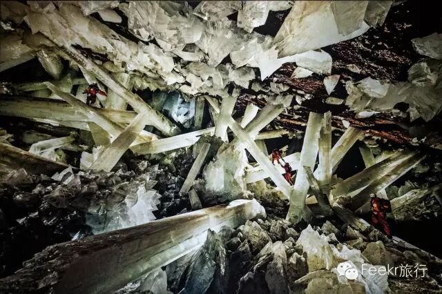 世界上最大的结晶体,在墨西哥的一个洞穴中,你可以看到其中的探险队员十分渺小,上万年的地质变幻才形成了这一自然奇观。